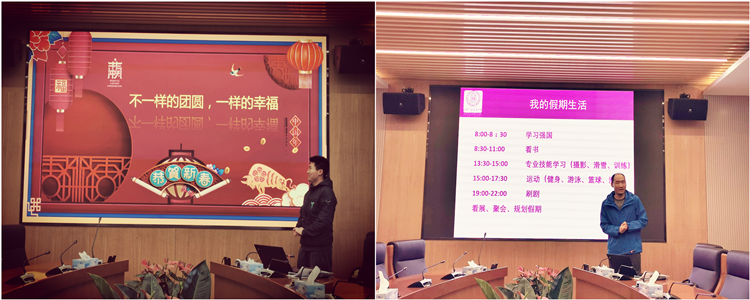 会议的第二部分是由期末组织生活第一次党员集中学习中获得三牛精神表彰的党员代表曹佩和李佳亮进行寒假理论学习汇报。