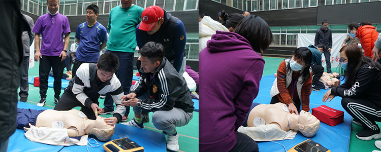 本次培训特别邀请清华大学校医院李亚军、杨霞两位大夫作为主讲专家进行培训。李亚军仔细讲解了心脏骤停的相关知识,并就如何进行心肺复苏、人工呼吸及AED使用等进行分步讲解。杨霞借助模型和“AED”培训机进行“心肺复苏”动作的现场演示,特别对急救姿势、AED的操作及相关要求进行了细致指导。