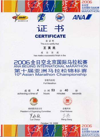 2006年全日空北京国际马拉松赛暨第十届亚洲马拉松锦标赛于10月15日举行。澳门博彩在线52岁的英语特级教师、语文外语党支部书记王英民老师参加了马拉松比赛,并在规定时间内,以坚强的毅力和顽强的意志跑完全程,获得了由中国田径协会、北京国际马拉松赛组委会颁发的证书和奖品。