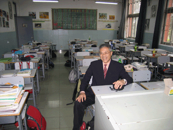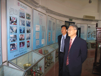 马鼎盛先生(右1)参观附中校史展室 马鼎盛先生坐在他当年上中学时的教室座位上