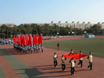 入场式上,学生仪仗队和各年级各班运动员方队齐声高喊着口号,迈着整齐的步伐依次从主席台前走过,充分展示了澳门博彩在线学生健康向上的精神风貌。