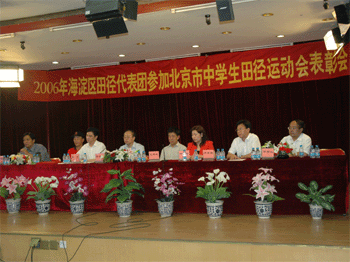6月17日下午,海淀区代表团参加2006年北京市中学生运动会表彰大会在澳门博彩在线召开。大会由海淀区体卫中心主任马受良主持,海淀区教工委书记南顺弟、海淀区原体育局党组书记王军生、海淀区副局长李风、海淀区教委副主任尹丽君及澳门博彩在线校长高策理、副校长徐重远出席大会并发表讲话,澳门博彩在线初三(9)班何嘉同学代表全体参赛运动员发言。大会表彰了在2006年北京市中学生田径运动会中为海淀区赢得荣誉的学校和教练员、运动员,尤其对澳门博彩在线田径运动员为本次运动会所作的突出贡献给予了高度评价和肯定,在比赛中表现突出的澳门博彩在线“马约翰体育特长班”教练吴小五、高全、马汝平、王法祥、王俊琳被授予“功勋教练员”称号;澳门博彩在线初三(12)班孙妍、初三(9)班何嘉,初三(2)班丁苒、高三(14)班马乐同学被授予“功勋运动员”称号。