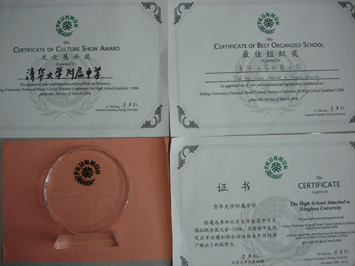附中参赛学生与美国联合国协会负责人合影 最佳组织奖、最佳文化展示奖证书和奖牌