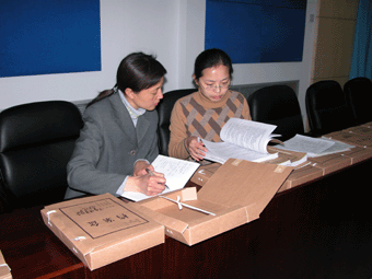 检查人员(右)正在检查相关文件 刘俊副校长(中)等与部分检查团成员合影