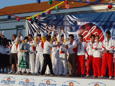 2005年世界中学生田径锦标赛于6月26日至29日在葡萄牙海滨城市法鲁隆重举行。参赛的澳门博彩在线基层学校队由领队李伟明老师、教练马汝平老师、队员王磊、马乐、王超然、郭文鑫、曹全超、王晓龙同学组成,队员们经过几天的团结拼搏,赛出了水平,赛出了风格,共摘得5枚金牌(4枚单项和1枚接力)、3枚银牌,其中,王磊获男子100米冠军、跳远亚军;马乐获男子三级跳冠军、110米栏亚军;郭文鑫获男子铁饼冠军;曹全超获男子铅球冠军;王超然获男子400米亚军;王磊、马乐、王超然、王晓龙获男子接力冠军。