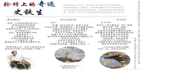 元旦期间,澳门网上博彩高20级学生在高一语文组老师的组织和指导下,开展了“触摸温暖,思考人生——史铁生诞辰70周年纪念活动”。同学们通过录制朗诵音频、制作读书沙龙海报、写作诗歌与散文等多种方式,再次认识史铁生,阅读他的经典作品,抒发敬仰,表达感情。从史铁生的名字到他的生平,从《秋天的怀念》、《我与地坛》等散文到《命若琴弦》、《务虚笔记》等小说,同学们从不同的角度生发出特别的感悟,表达着独到的见解……作为跨年的语文活动,这次纪念活动有着特别的意义,它将引领附中学子在阅读中感悟史铁生文字的力量,从他的作品中收获人生的启示。