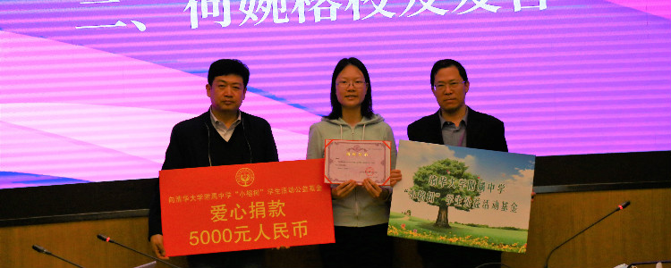 发言结束后,何婉榕把她在大学获得的5000元奖学金捐给“小榕树”公益基金会,白雪峰副校长为她颁发了捐赠证书。