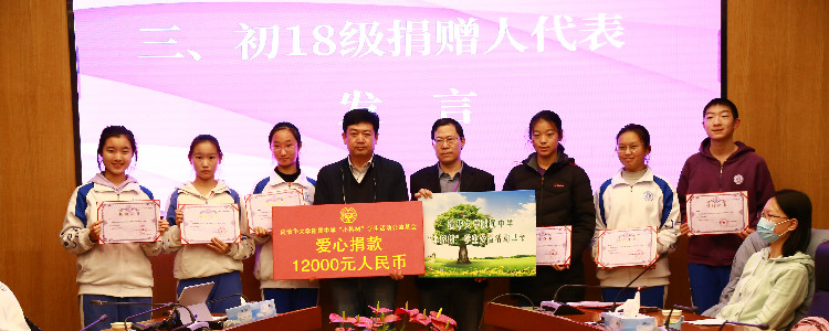 白雪峰副校长(左四)和侯进科秘书长(右四)为初18级6位捐赠人颁发捐赠证书