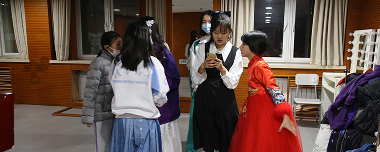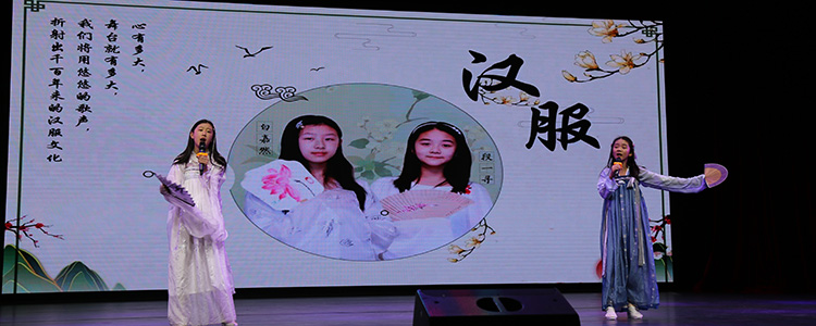 “越罗衫袂迎春风,玉刻麒麟腰带红”,初2009班白嘉然和段一寻组合用清澈婉转的歌声表达了她们对汉服的喜爱。