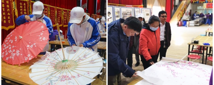 在制作油纸伞活动中,老师指导同学们先用线固定伞骨,再将画着美丽国画的油纸糊在伞骨上。同学们聚精会神地操作着。不久,成形的油纸伞为大厅增添了一股风韵。