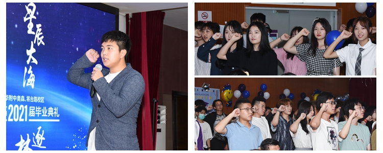 学生代表带领学生们进行毕业宣誓:“牢记母校培养,维护母校荣誉;不负父母期盼,不负老师厚望;面对困难,从容不迫;面对挫折,勇往直前;以青春和热血报效祖国,以聪慧和才智奉献社会;自强不息,用汗水浇灌理想;厚德载物,用品德影响他人。”