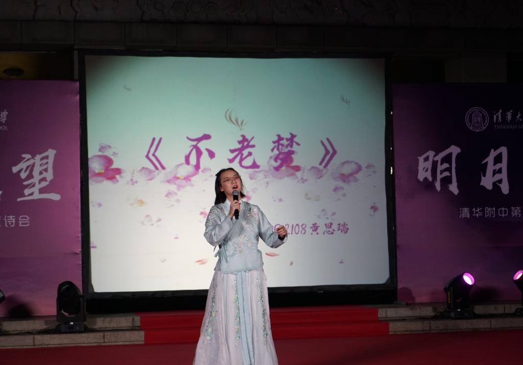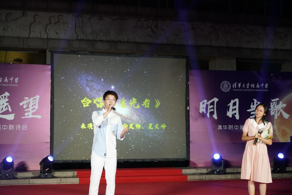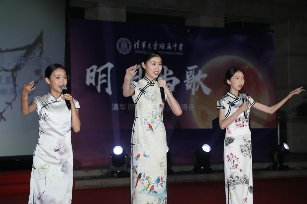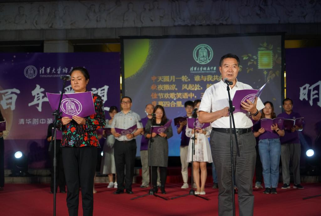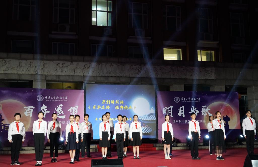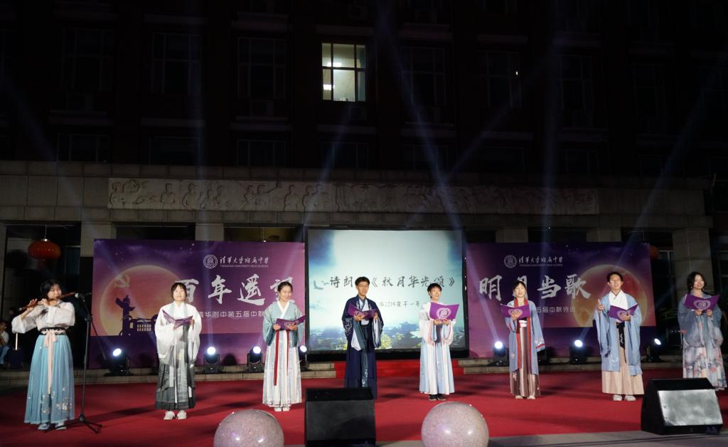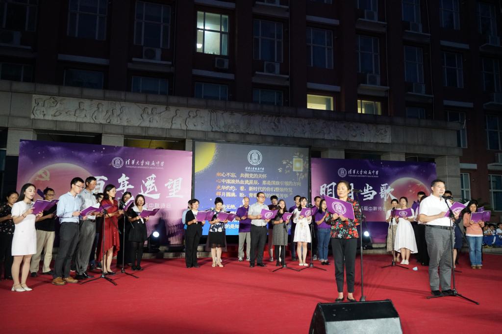 《花好月圆》的乐声在师生心里点起的层层波澜还未平复,由理化生党支部和教工团所带来的诗朗诵《月满中秋 桃李清华》又让人想起在不同领域各自发光的清华学子和优秀的附中人。朗诵词中精心安排的藏头“初心光辉,薪火相传。水木清华,春满心田”,更是唤起了在座所有清华人的骄傲与自豪。