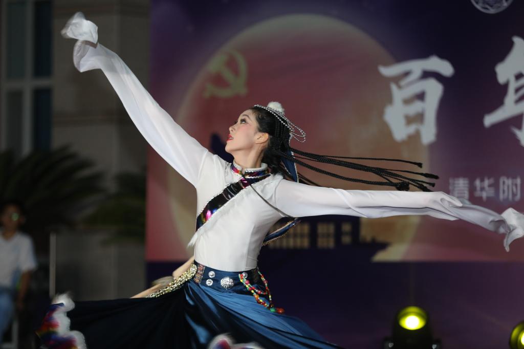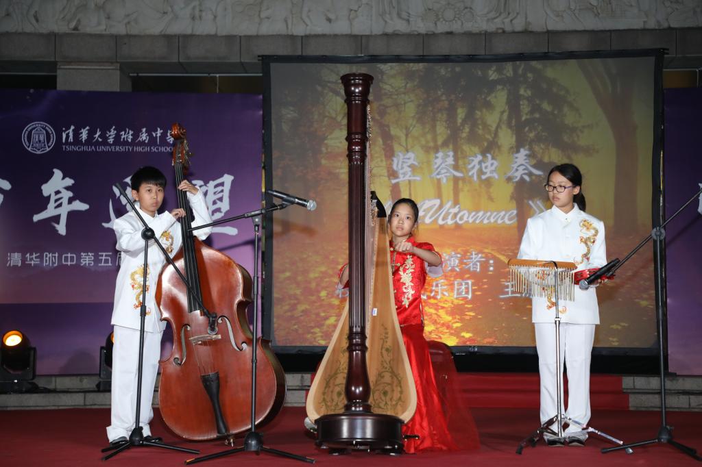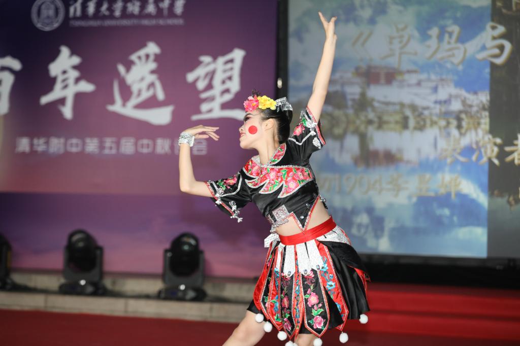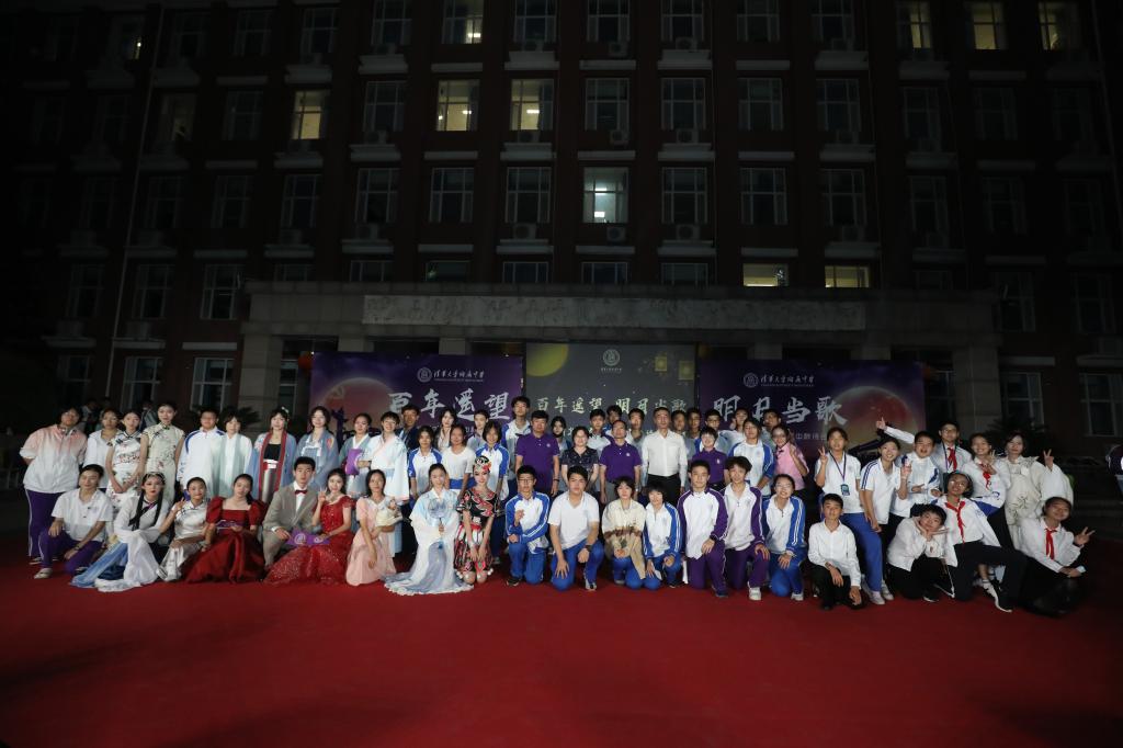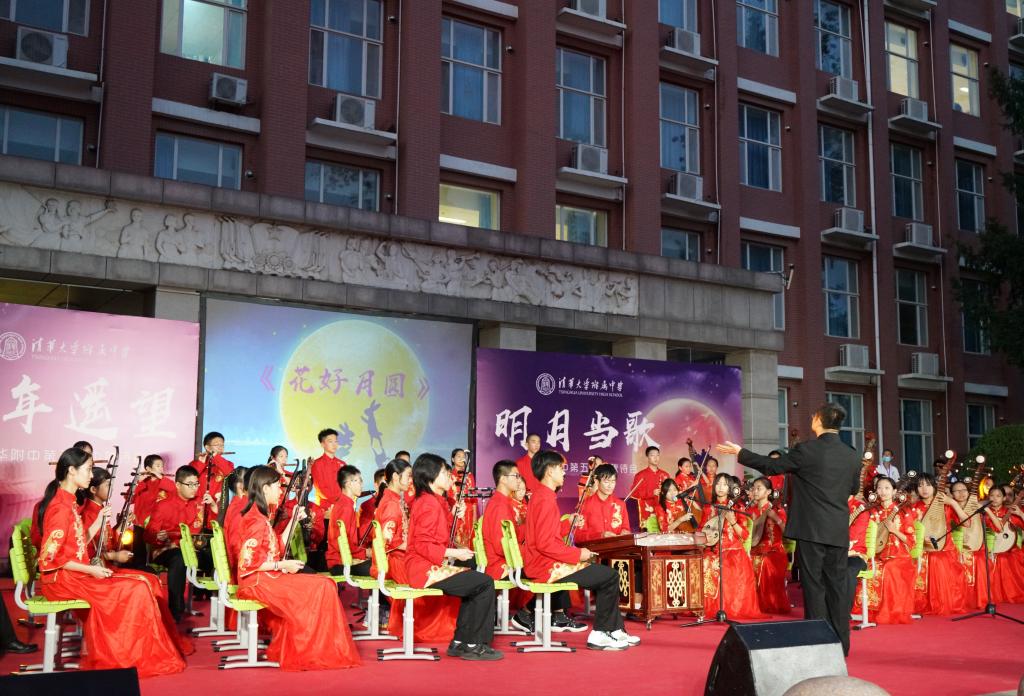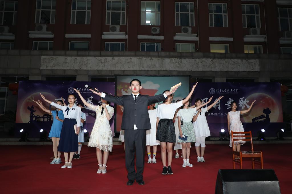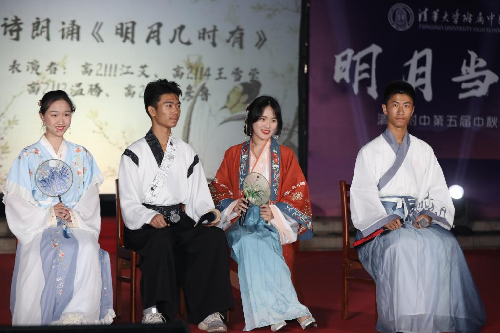 《花好月圆》的乐声在师生心里点起的层层波澜还未平复,由理化生党支部和教工团所带来的诗朗诵《月满中秋 桃李清华》又让人想起在不同领域各自发光的清华学子和优秀的附中人。朗诵词中精心安排的藏头“初心光辉,薪火相传。水木清华,春满心田”,更是唤起了在座所有清华人的骄傲与自豪。