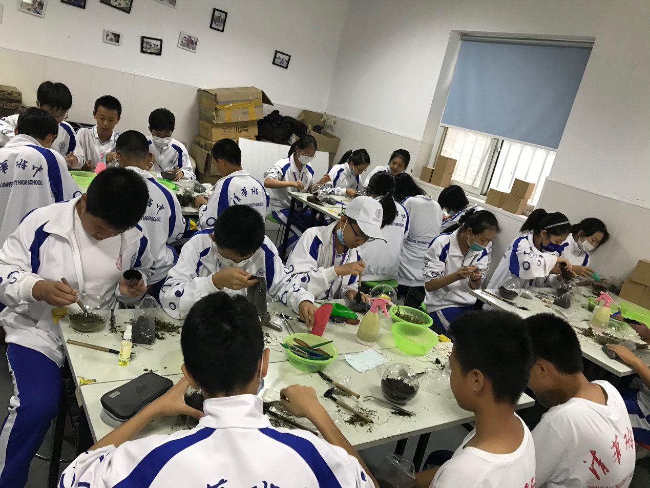 提取芳香植物纯露让同学们提前感受了一把化学实验的魅力。制作微景观需要美学和植物学功底,同学们从中体悟自然与美的结合。