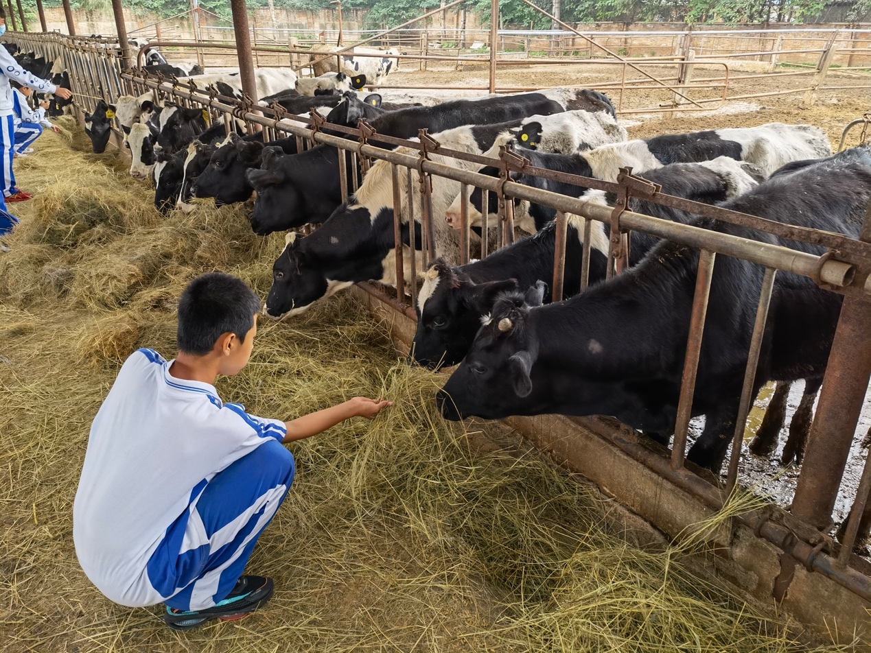 同学们还参观了养牛场。虽然牛场的味道并不“芳香扑鼻”,但是看到可爱的奶牛们,大家还是开心地和它们打招呼,还给牛喂食了草料。