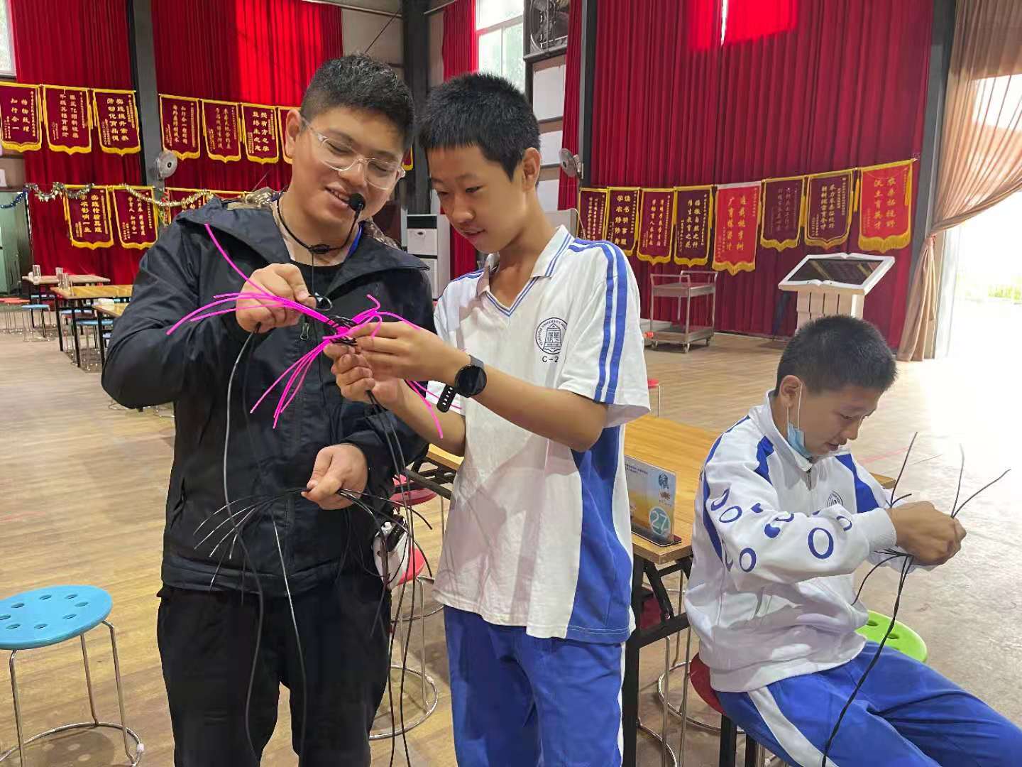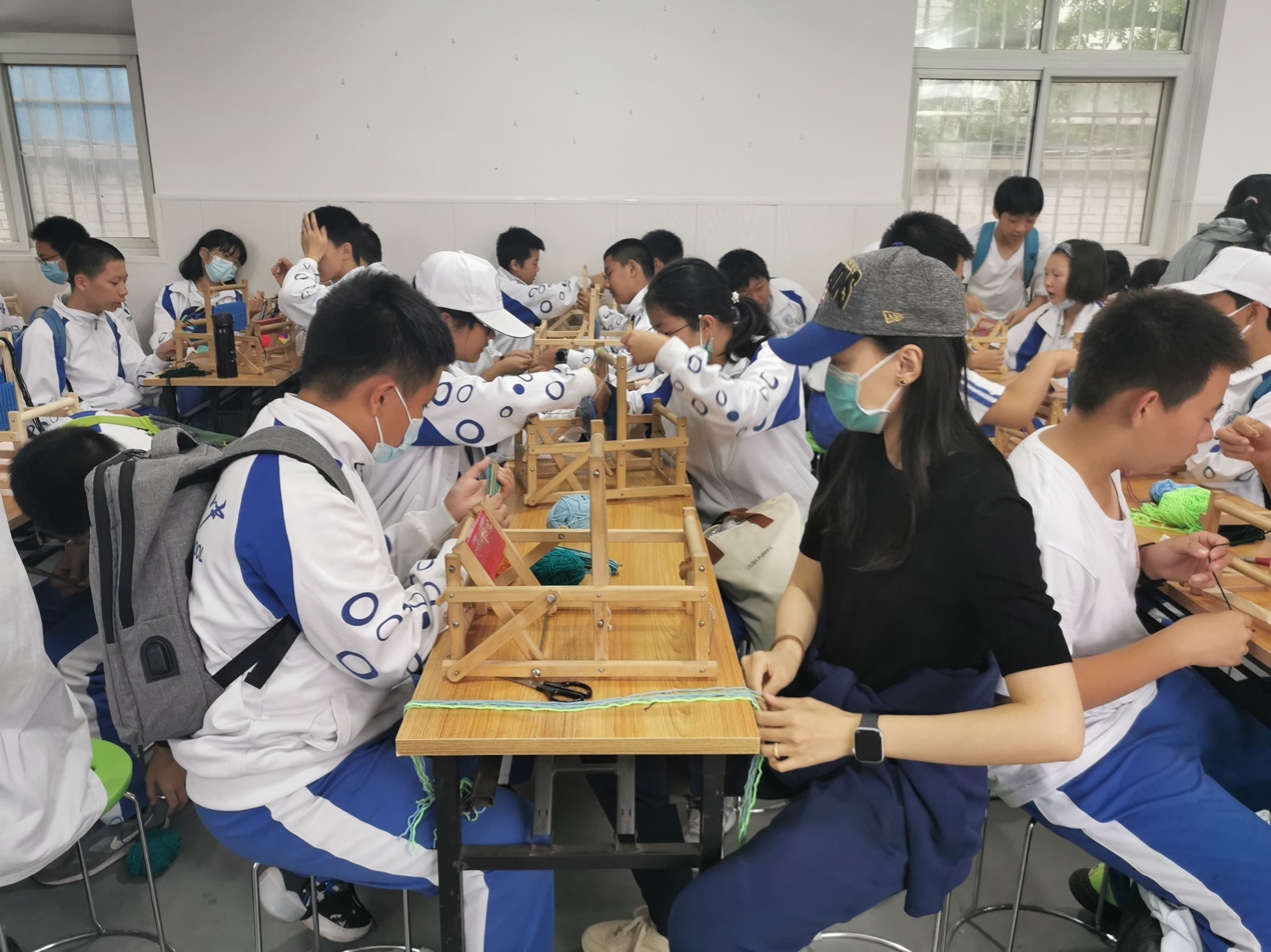 在老师的指导下,同学们用原始的织布工具织布,别有一番体验。