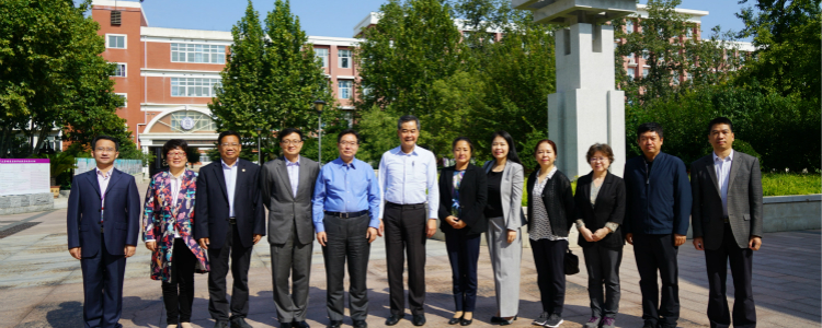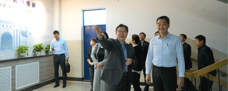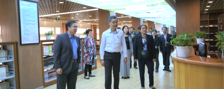 校长王殿军、党委书记方妍(前排右)陪同全国政协副主席梁振英参观图书馆