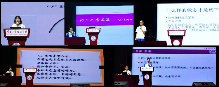 接着上场的冯瑞宣学姐和同学们交流了初三学习生活态度问题。她建议同学们要自律,并给出具体的建议帮助同学们培养、提升自律能力。她分享了一段暖心小视频,建议同学们要丰富人生,快乐充实地生活。最后上场的是陈思齐、陈思危同学,这对双胞胎兄弟着重介绍了初三的日常生活和体育锻炼。他们建议同学们要规律作息,不要熬夜。他们还介绍了初三时期如何与老师、同学、家长沟通。体育锻炼方面,两位学长也给出了许多真切的建议,如晨跑、培养球感等。六位学长学姐全面、细致、务实的分享帮助同学们充分认识了初三是什么。