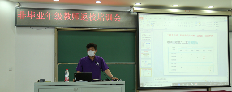 2020年5月28日,澳门网上博彩在华茂楼208召开小六、初高中非毕业年级开学教师培训会。澳门网上博彩党政领导及小六、初高中非毕业年级教师共200多名教师参加了会议,会议由教学管理与研究中心主任张苏主持。