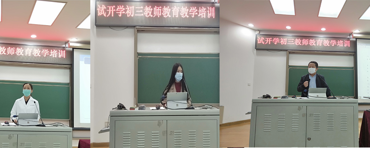 医务室负责人王艳敏(左)、心理办公室教师叶怡君(中)、资源保障中心副主任孙书明(右)给老师们做相关培训