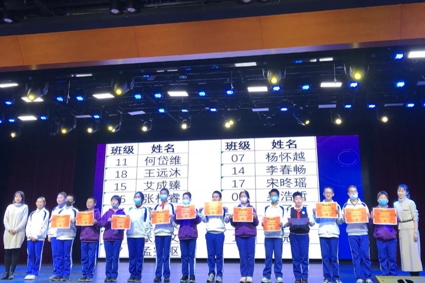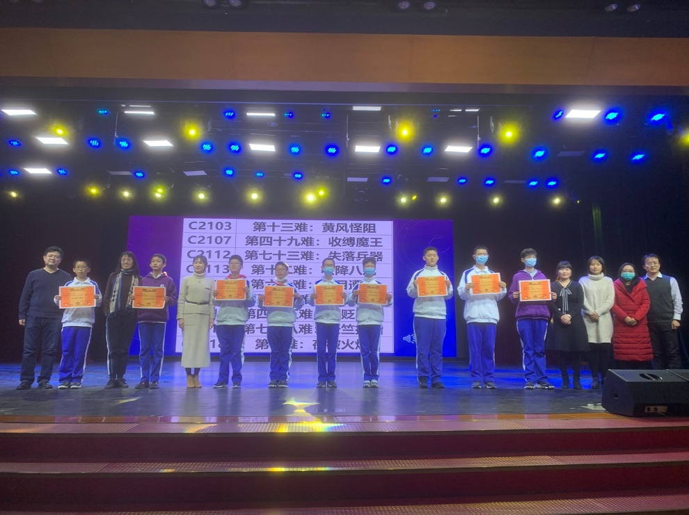 开场表演由初2115班熊浩洋、周昊博、张柏睿等同学带来《西游记》主题曲串烧,古典音乐与现代轻摇滚音乐的完美结合,给现场的同学们带来美妙的享受。表演结束后,由那妮老师和徐利老师向《西游记》百题竞赛的获奖者颁奖。