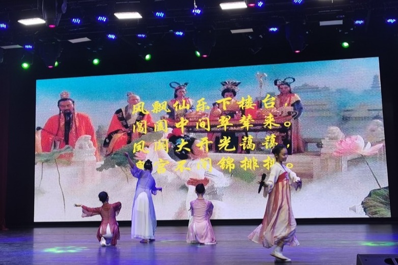 随后,初2112班的马明玥等同学带来舞蹈表演《凤阙宫宴赋》。伴随着悠扬婉转的诗音,翩翩起舞的仙女仿佛把观众带到了《西游记》中天宫的情境里,精彩绝伦,令人如梦如醉。