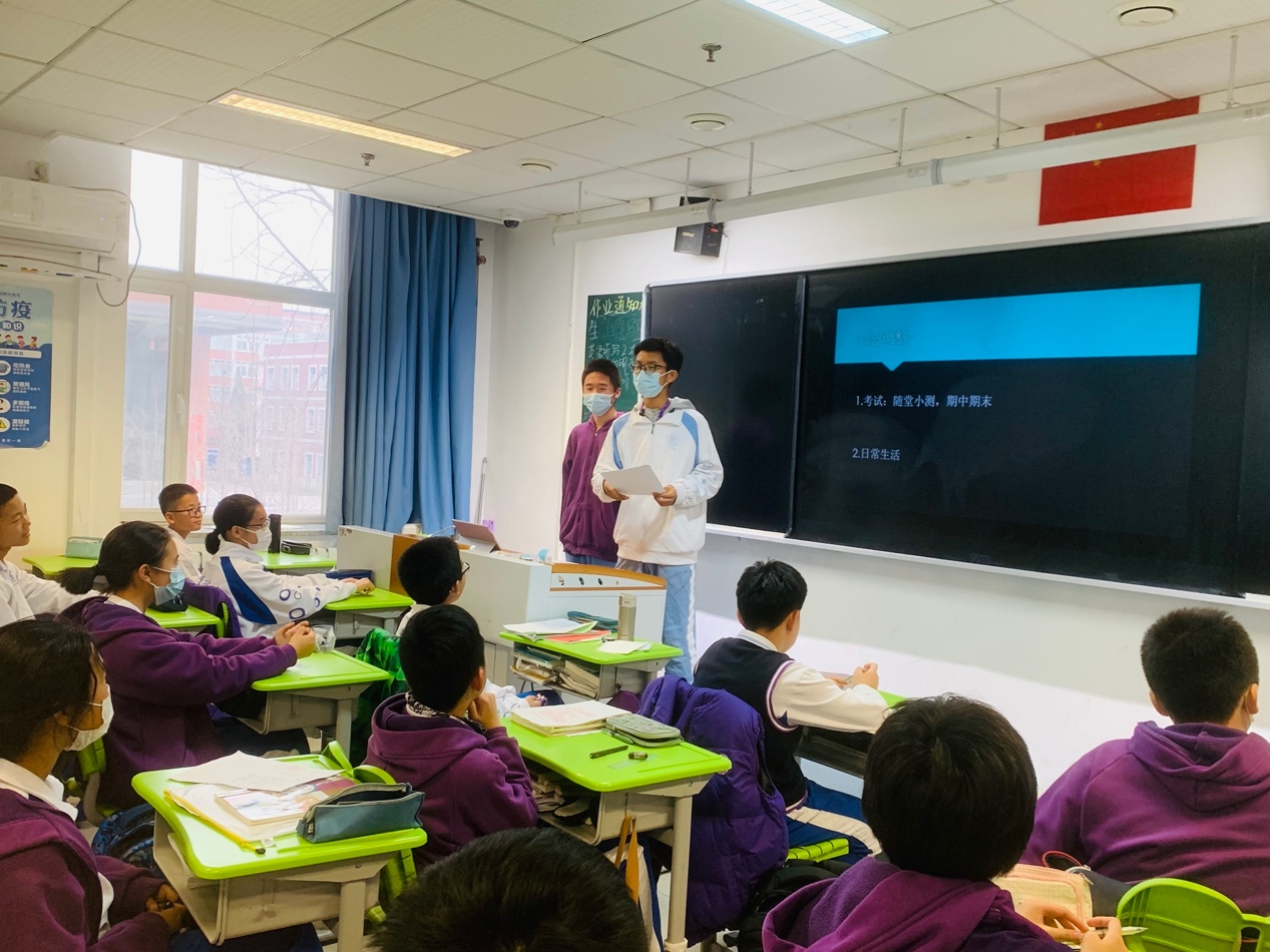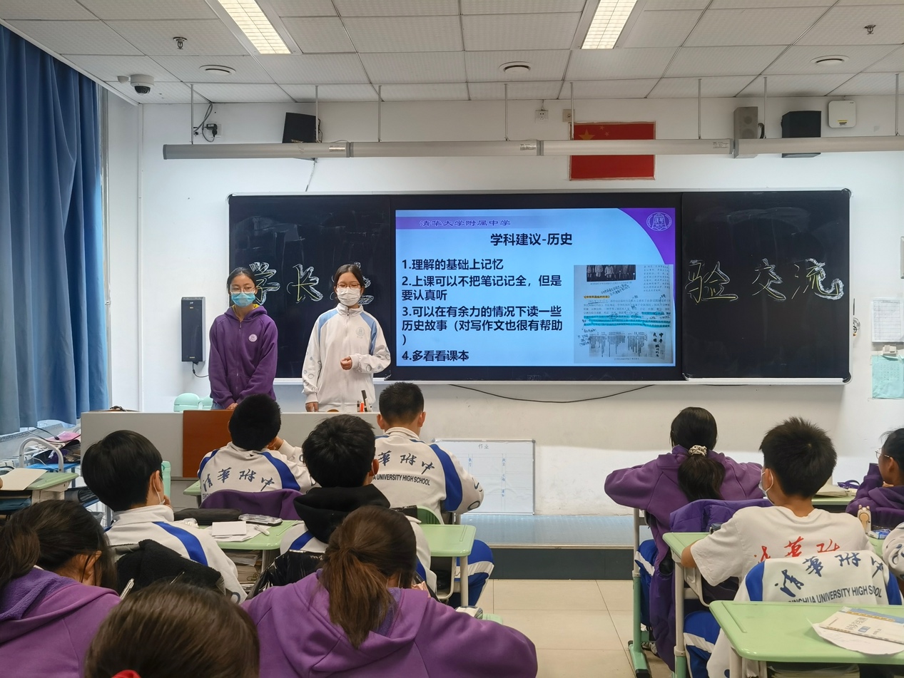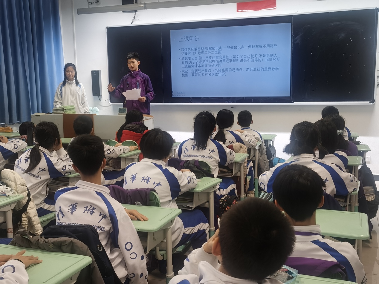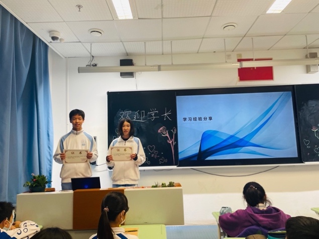 初2003班的陶墨和崔子榆学长向初2103班同学介绍经验