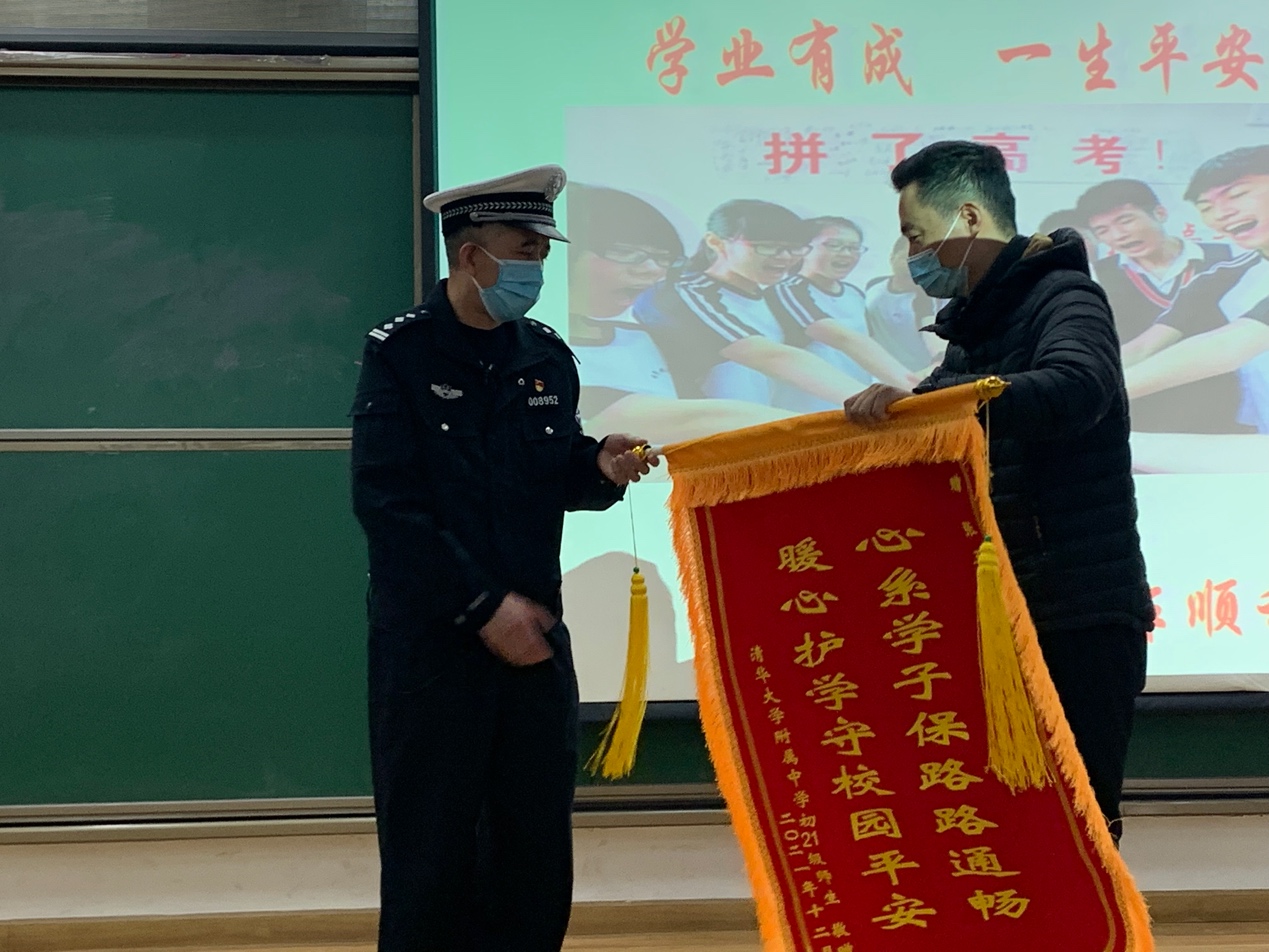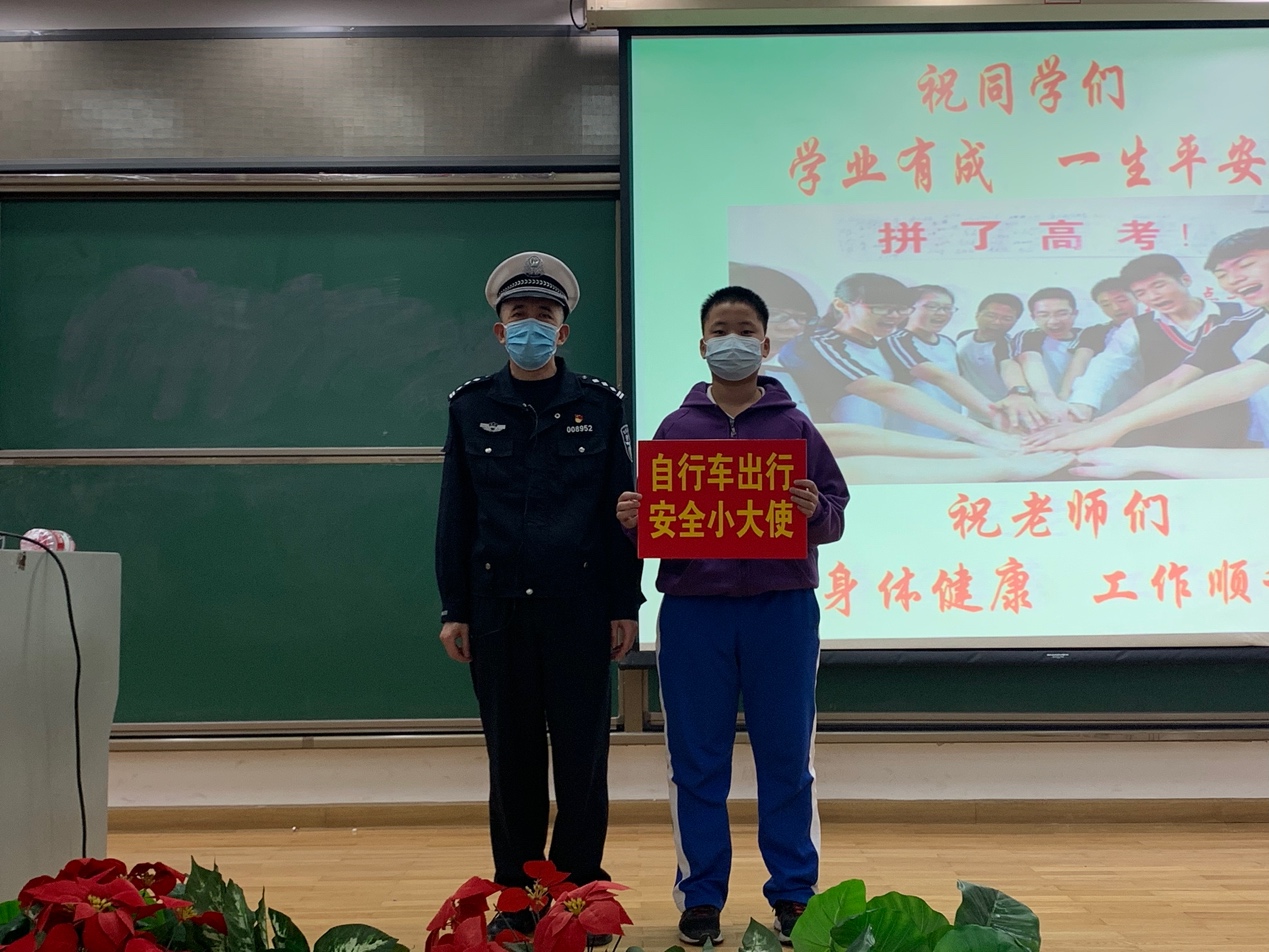 张警官生动的宣讲获得同学们的阵阵掌声。在活动最后,由杨国兴老师代表初21级师生向张警官赠送锦旗。随后,张警官为初2112班班级代表颁发“自行车出行安全小大使”称号。