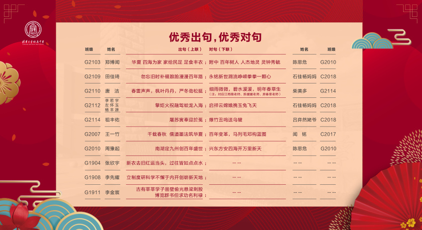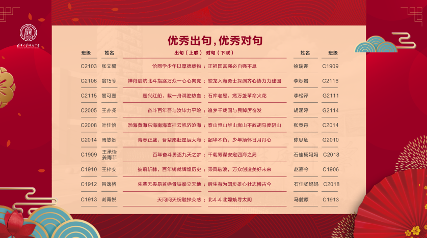 在楹联对句环节,师生及家长各尽其才,佳联妙对,尽显风流。楹联对句通过微信平台征集,语文教研组精心挑选出了最佳出句20句,最佳对句17句。