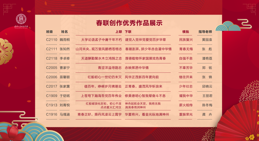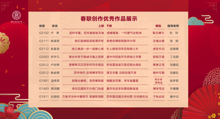 2021年12月,澳门博彩在线举办了第十一届新年春联创作与书写大赛,活动围绕“百年新征程,奋斗正青春”为主题,活动历时一个月,共收到学生楹联对句作品300余份、春联创作近200幅,书写作品近百幅,寓意吉祥的对联字字寄托着附中学子生逢盛世的豪情与肩负强国使命的担当。