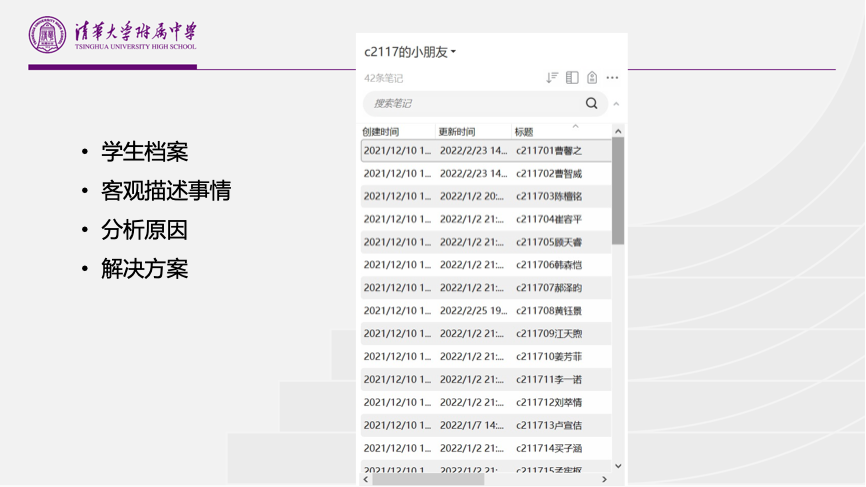 面对思维活跃、喜欢探索的学生们,黄芊芊老师的班级管理自成体系。无规矩不成方圆,班级建设从班委开始。带领班委从卫生、考勤、作业等各个方面建立细则,引导他们在自律基础上和同学们互相监督;指导班委对各种场景、活动可能出现的问题进行预判以期面对问题忙而不乱。日常的班会班级活动充分调动学生积极性,以学生兴趣为导向,接受学生报名情况确定主题。由于学生领导力有限,也有计划不周密、内容不详尽、时间不合理等其他不成熟情况,在热情主动的基础上要求学生书写更详尽的班会预案,更能促进学生全面发展。建立学生档案也是班级管理的好帮手,客观描述事件、理性分析原因、谨慎解决问题,记录学生们的一路成长。