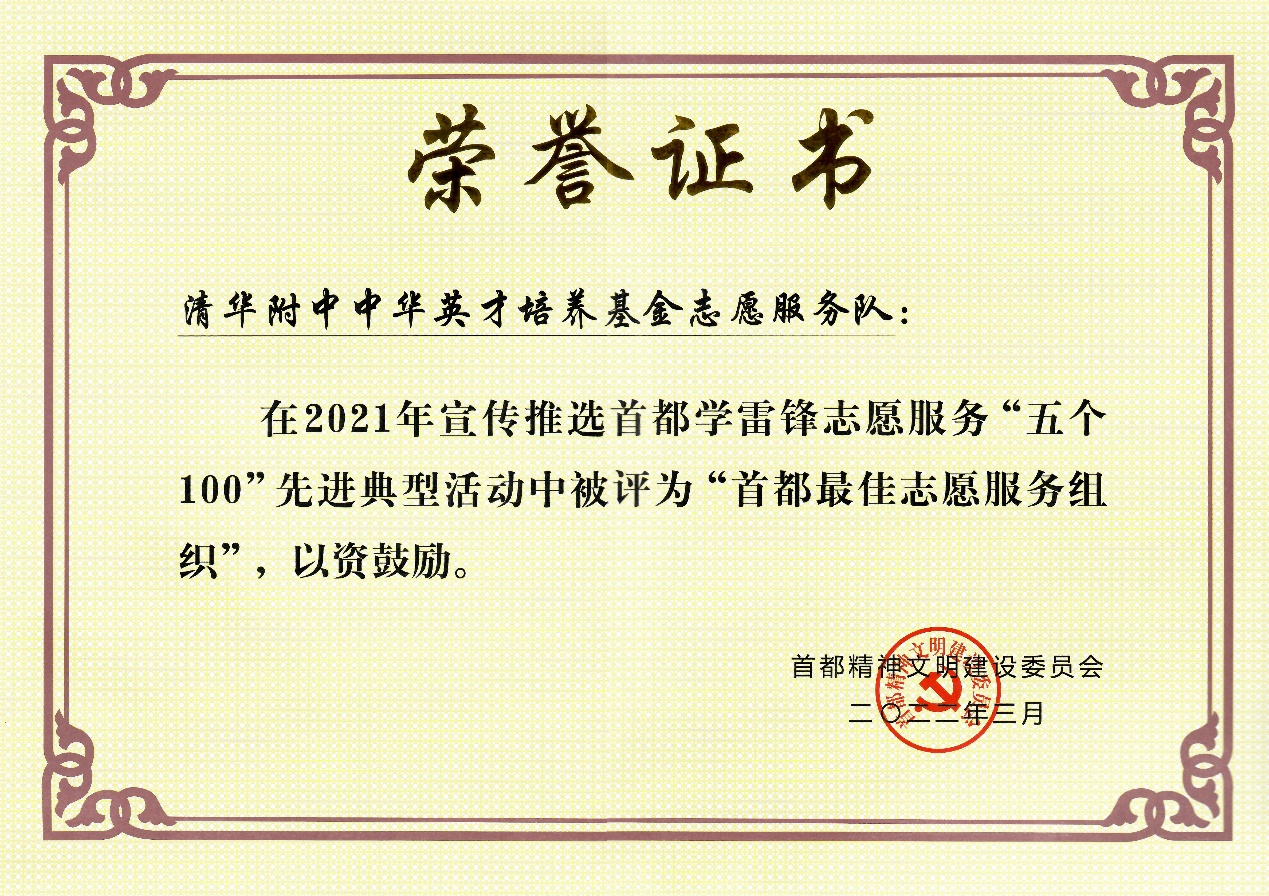 澳门网上博彩中华英才培养基金志愿服务队在2021年宣传推选首都学雷锋志愿服务“五个100”先进典型活动中被评为“首都最佳志愿服务组织”。2019年,澳门网上博彩“中华英才培养”志愿服务项目曾荣获“首都最佳志愿服务项目”。