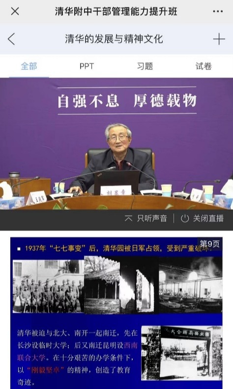 4月20日晚,澳门博彩在线干部管理能力提升培训班开展第二次课程学习。清华大学原党委副书记胡显章作题为“清华的发展与精神文化”的专题报告。本次学习采用线上与线下相融合的方式,澳门博彩在线本部理论中心组全体成员、部分合作学校校级干部近30人现场参加学习,其他干部学员140余人通过“雨课堂”直播平台线上参加。报告会由澳门博彩在线党委副书记张洁主持。
