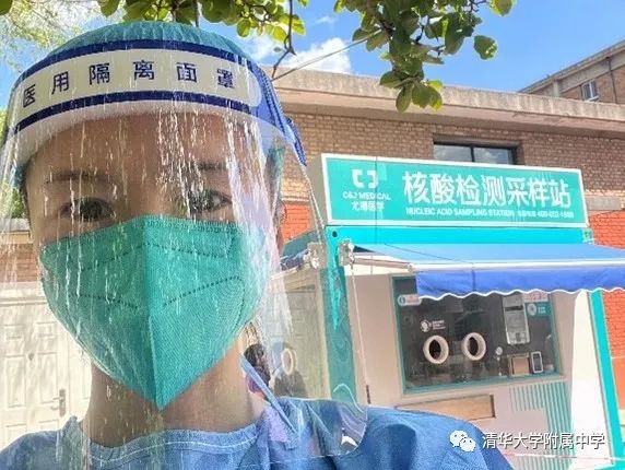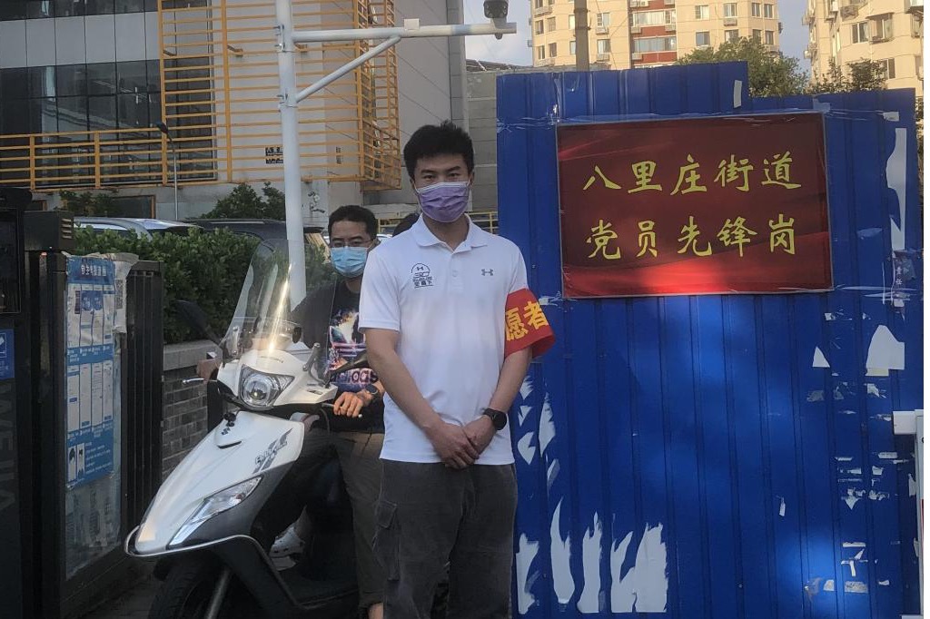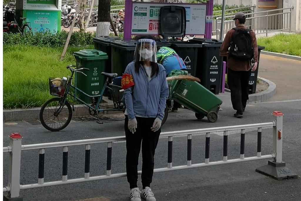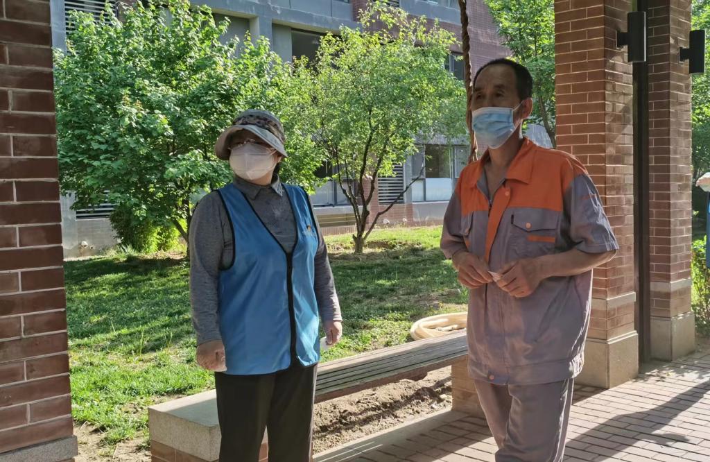 5月24日下午,白建娥老师担任双清苑小区东南门志愿者,负责提醒进入小区的人员扫描北京健康宝并清理地面积水。