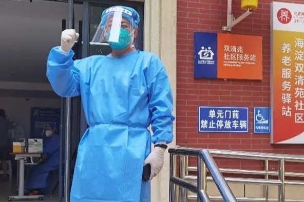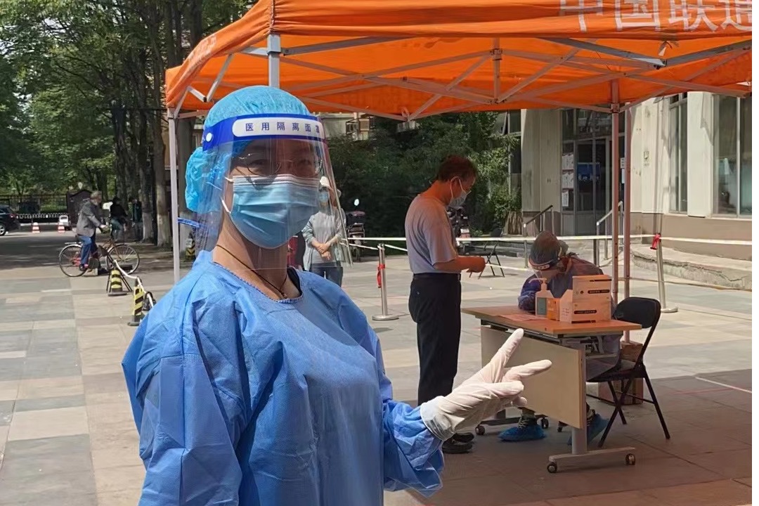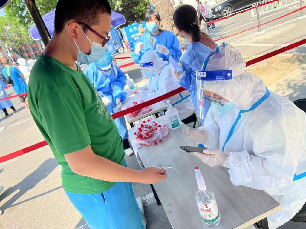 熊学勤老师在社区志愿核酸采样辅助服务。