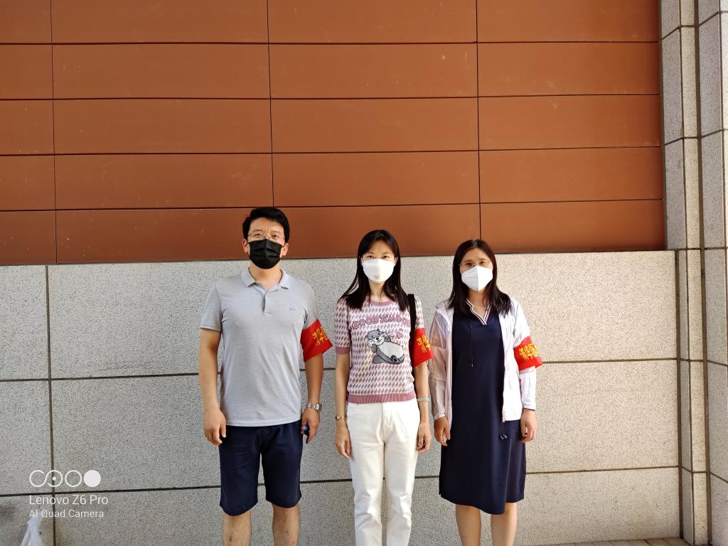 何晨丽老师(左二)参与学清苑小区门口值班志愿服务。