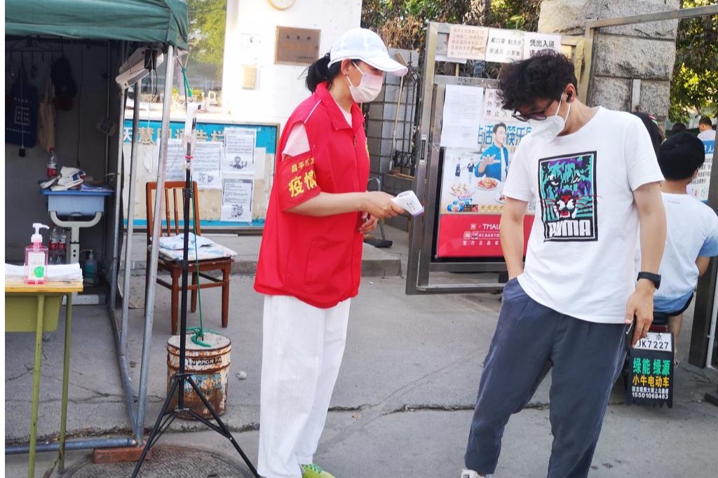 王田老师在西南社区做志愿者,负责进门的测温和维持秩序。