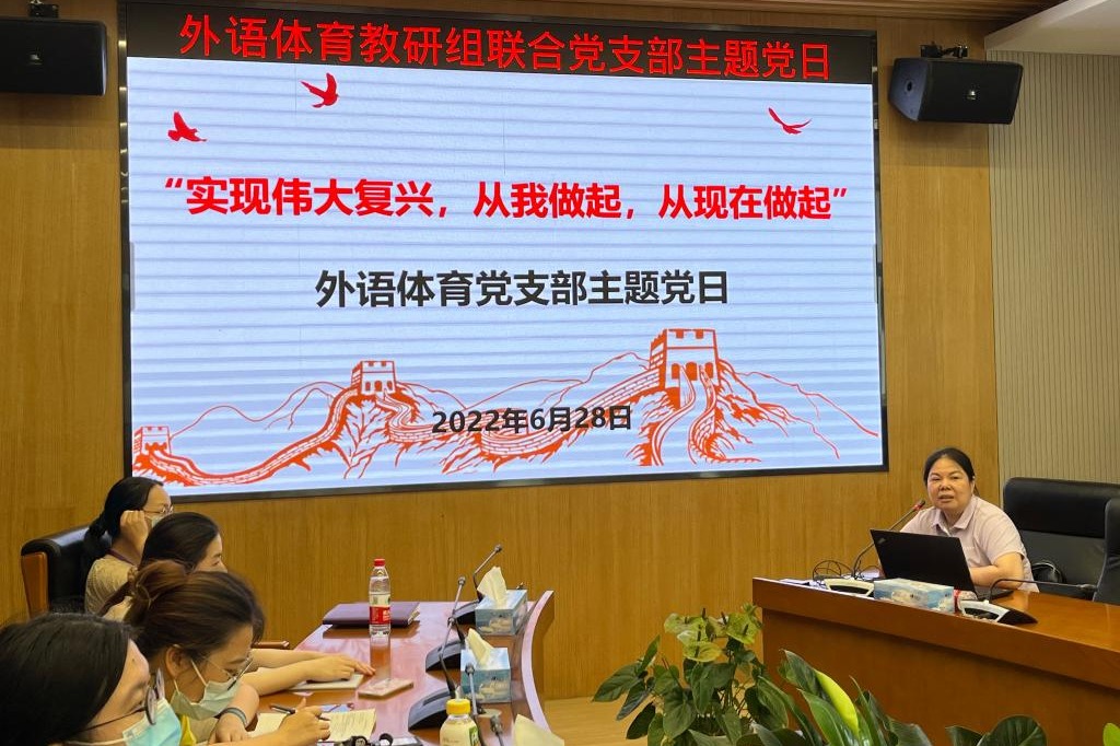 2022年6月28日下午,外语体育教研组联合党支部以“实现伟大复兴,从我做起,从现在做起”为主题,开展主题党日。支部党员37人、积极分子及群众8人参加了本次主题党日。