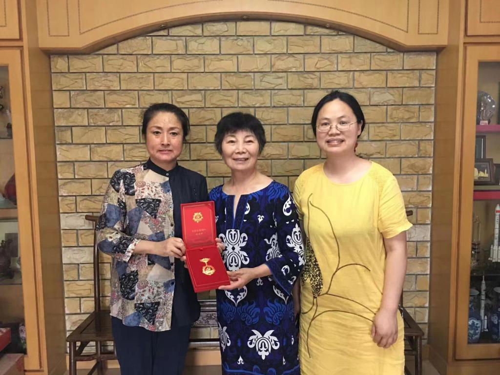 党委书记方妍(左)为金郁向老师(中)颁发纪念章