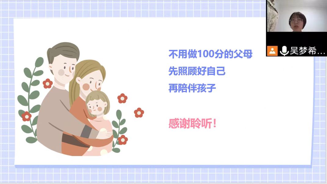 吴梦希老师和家长们交流了同学返校后心态,建议家长们多理解孩子现阶段的焦虑,建议家长先放平心态,调整期待,更能帮助孩子降低焦虑,适应学校生活。亲子关系是家庭教育最重要的地基。只有亲子关系是牢固的,孩子才能理解和吸收父母的爱。