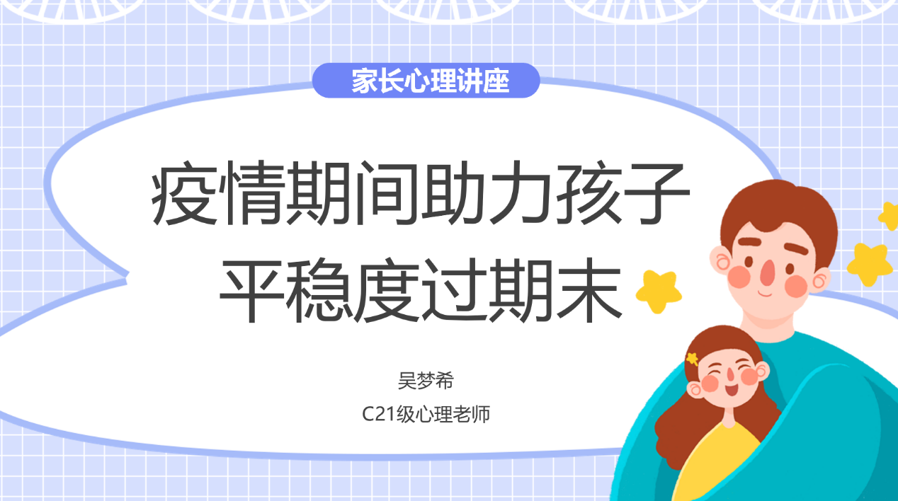 20202年6月26日晚,在疫情居家即将返校之际,澳门博彩在线初21级开展了以“疫情期间助力孩子平稳度过期末”为主题的家长学校讲座。初21级心理老师吴梦希通过课堂讨论、问卷调查、课下交流等方式了解了学生近期状态,并就家长如何助力孩子适应返校、平稳度过期末等方面开展了交流,探讨了促进孩子多种能力提升的方法。初21级年级组长张彪老师、副组长李冰清老师以及初一家长参加了线上讲座。