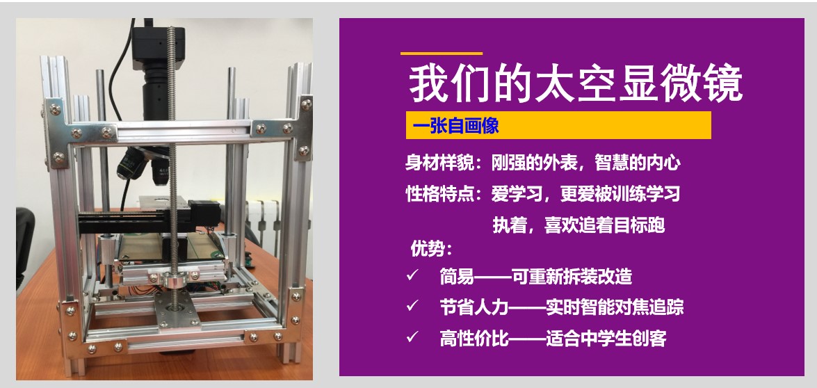 “我们的太空显微镜,既有刚强的外表(硬件),又拥有智慧的内心(软件)”。要研发一款供航天员在空间站使用的实时智能显微镜,需要学生综合设计思维、计算思维,进行创新实践、团队合作、优化迭代。学生基于在科学仪器创客社团中对经典显微镜、拉曼光谱仪等科学仪器的发明与创新改造经验,以及在人工智能创客社团中对python编程、人工智能算法的理解与实践基础,自主设计搭建显微镜硬件,并编程实现了显微镜的自动对焦、智能识别与追踪。学生通过自主设计并搭建现代科学仪器,不但能够习得如何制造实验仪器的基本技能,还能用其验证基本科学理论,促进课内学习,真正做到“学中做,做中学”。同时学生还利用设计出的仪器尝试解决实际问题,提高了他们的自我探索能力、合作能力、以及快速学习能力。