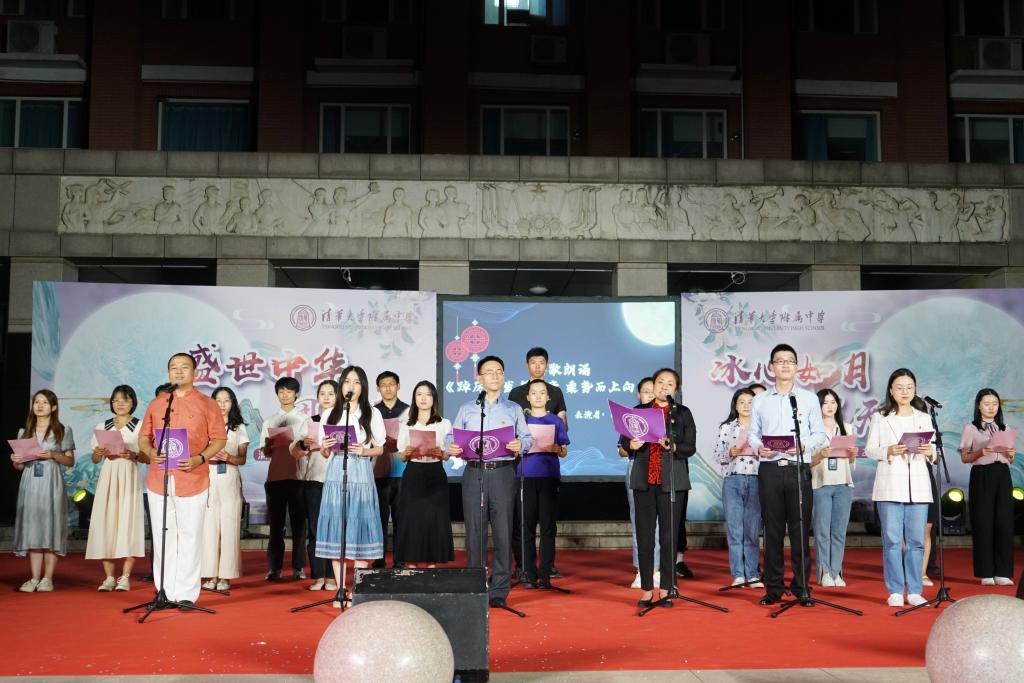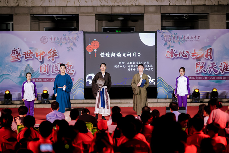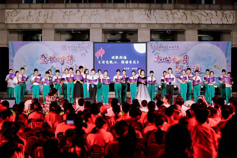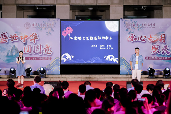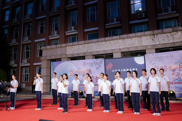 诗歌朗诵《望月—中秋里的家与国》,由小家到大家再至国家,由此及彼,以己推人。皇皇天目、朗朗乾坤,见证着附中学子深沉厚重的家国情怀。亲子的温润朗诵,描绘出家庭的温馨;附中的大家庭中,在老师的尽心之下,学生的奋斗之中,奏响“与子同袍”的口号。初2112梁珈烨、高2114王麦青、高2110王彦鲁清脆嗓音,在诺大的广场上回响,台下击起层层涟漪,附中学子们耳旁听着铿锵谈吐,目中带光,新一辈青年为中华民族伟大复兴的决心在学子们心中清脆炸响。