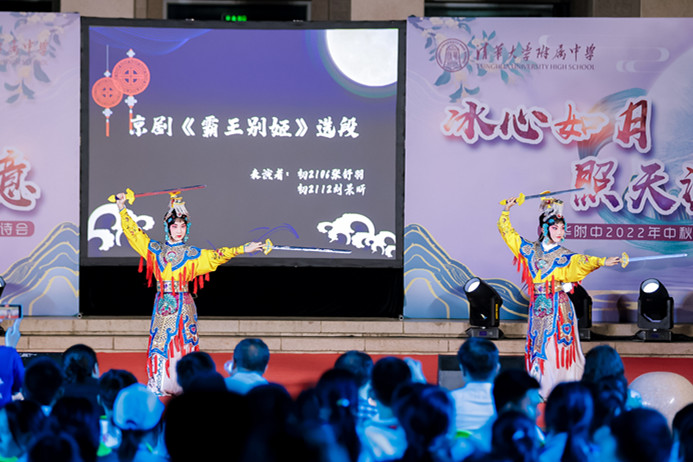 高21级的原创情景诗朗诵《问月》,立足月下,以吾辈之志向青天朗月发问,何谓未来,何称当下?苏东坡、李太白、屈灵均等历史哲家踏上舞台,为学子们一一解惑。但见台上学子拂袖,目光微凝,合声道:“明月不在头顶,不在水中,而在你我心上”。附中学子在圆月之下,与哲人跨越时空对话;他们明了,永恒的追求——答案自在心中飘扬。