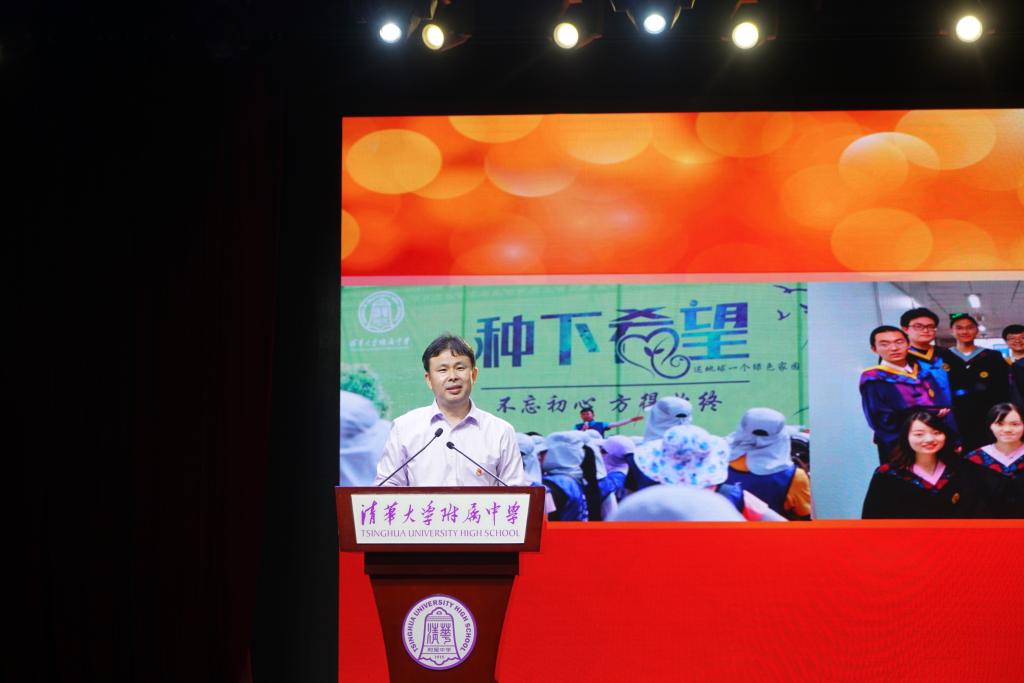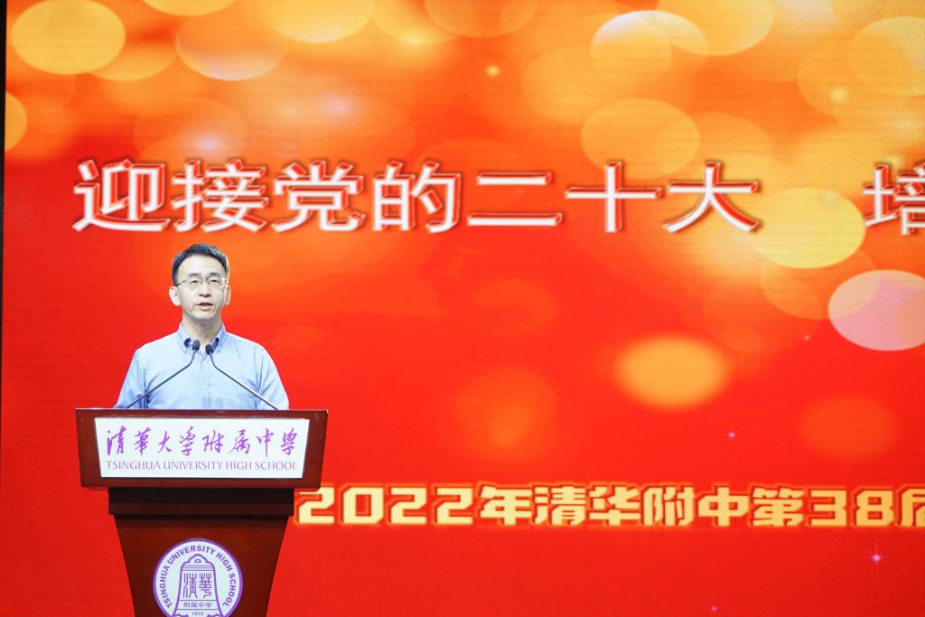 清华大学校务委员会副主任、附校工作领导小组组长姜胜耀老师致辞,他代表清华大学向附中全体教职工表达节日的祝福。他提出,今年的教师节时间特殊、意义重大,再过不久,我们将喜迎党的二十大。当前中国发展正处于“两个一百年”奋斗目标的历史交汇期,我们也比历史上任何时期都更接近、更有信心和能力实现中华民族伟大复兴的目标。这十年,全体“清华师者”牢记习近平总书记嘱托,不负时代使命、不负人民期望,坚持把立德树人作为根本任务,努力为党育人、为国育才。他希望附中的老师们继续传承“清华师者”爱党爱国、倾心育人、严谨治学的宝贵精神传统,以师者之信仰、师者之才学、师者之德行,擂起新时代“为党育新人”的战鼓,擎起新征程“为国育大才”的大旗,努力成为扎根杏坛、仁爱奉献、崇德修身、潜心育人的“大先生”。