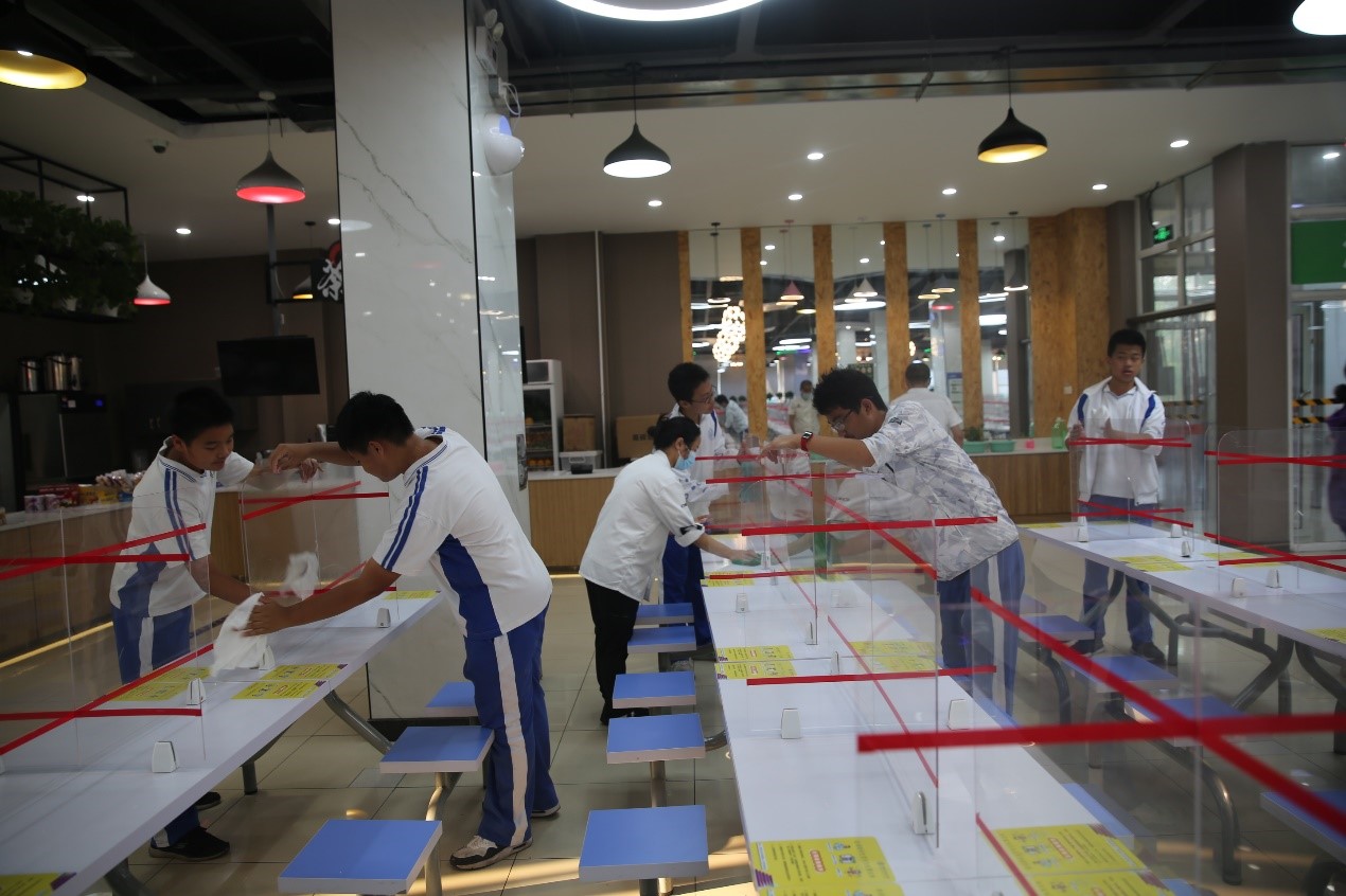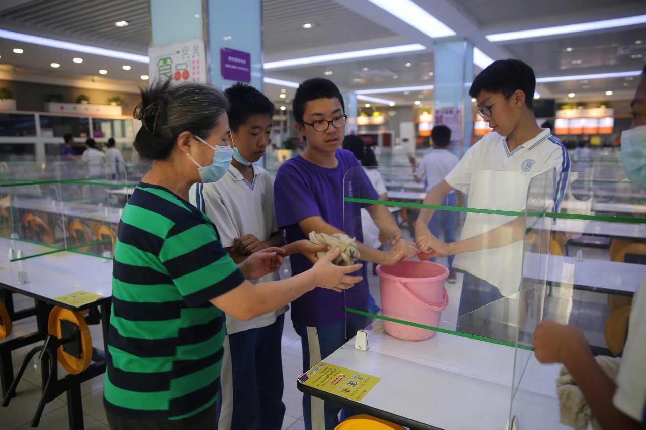 附中食堂,是学生们校园生活的重要补给站,今天,初二的学生们带好清扫工具来到食堂,在食堂劳动教育指导教师的耐心指导下,认真地擦拭餐桌与防疫屏,同学们在劳动中提升技能、磨练意志,一位参与劳动的学生表示:“这次劳动课程让我体会到劳动者的艰辛,今后我也要继续做守护食堂、爱护校园的辛勤附中人。”