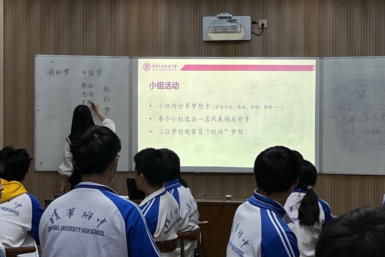 许老师首先组织大家分组讨论自己的梦想,并邀请“梦想观察员”做锐评。同学们积极参与,真诚分享,视角多元,思考深邃,从未来职业、生活态度、兴趣指引、个人发展、社会影响等方面谈论梦想,并认识到梦想与现实间的距离,以及我与世界的关系,领悟到以行动追梦,与他人共振的重要性。接着,许老师播放了家长和老师代表谈梦想的视频。同学们因父辈的家国情怀而感动,并怀着热忱分享了各自的体会。最后,7班同学为在座的班主任老师送去各班同学精心准备的梦想卡片,班会在温暖的气氛中结束。