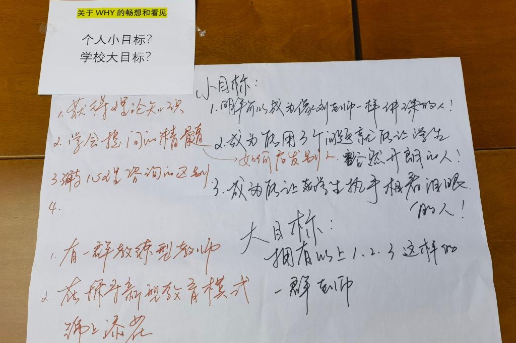 随后,刘雪茹教练带领大家进行“一人一故事”破冰环节,邀请每位老师用简短的几句话讲述一个自己与“教练”的故事,可以是自己对“教练”的理解,或是自己过往经历中与“教练”发生的事情。每位老师或是分享了自己的理解与故事,或是提出了疑问。刘雪茹教练一一记录并给予回应。紧接着,刘雪茹教练给出了三个问题,请老师们分组讨论。围绕着:“我们是谁”、“我们为什么要做教练型教师”以及“我们如何做教练型教师”,各小组老师们展开了激烈且有趣的讨论。