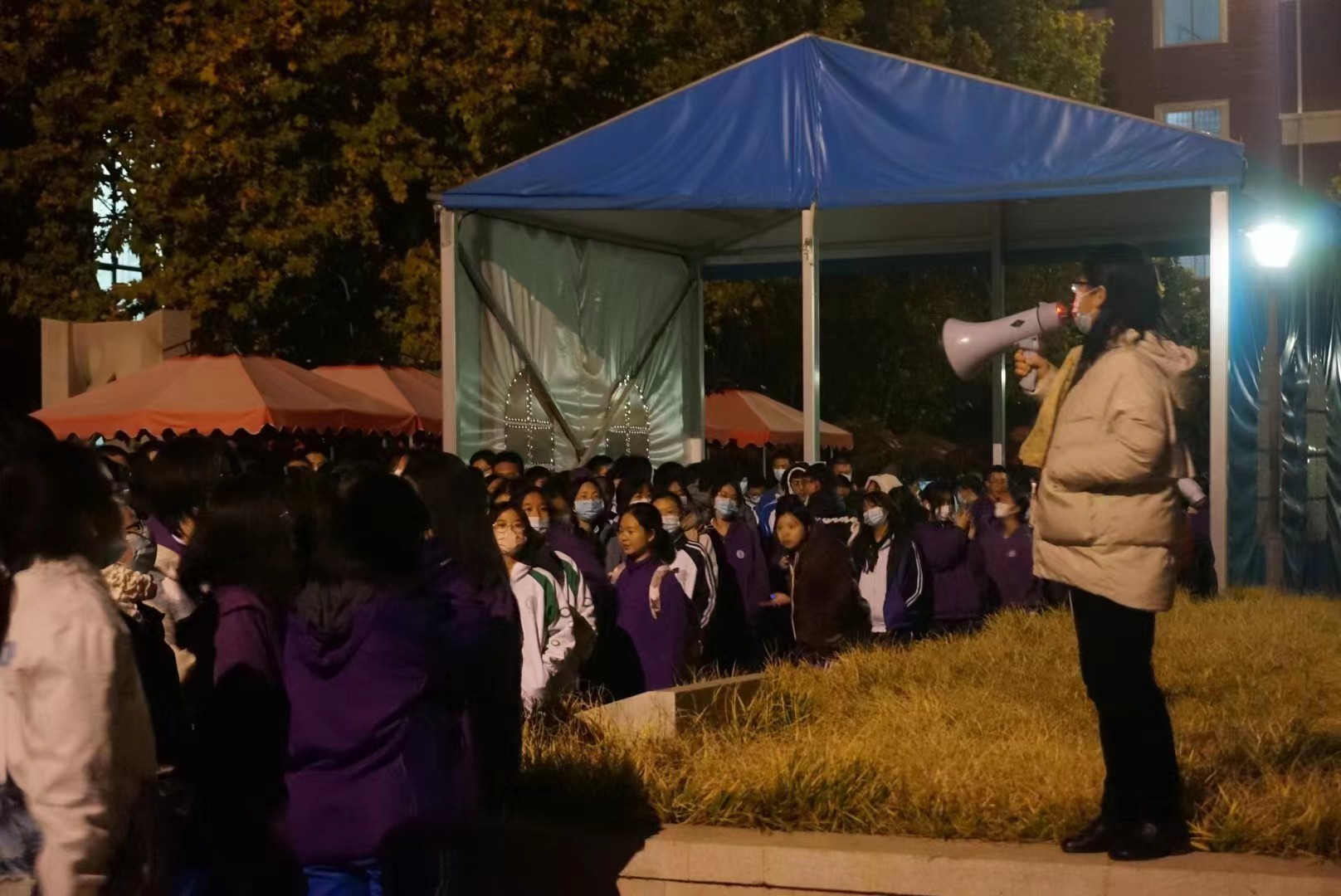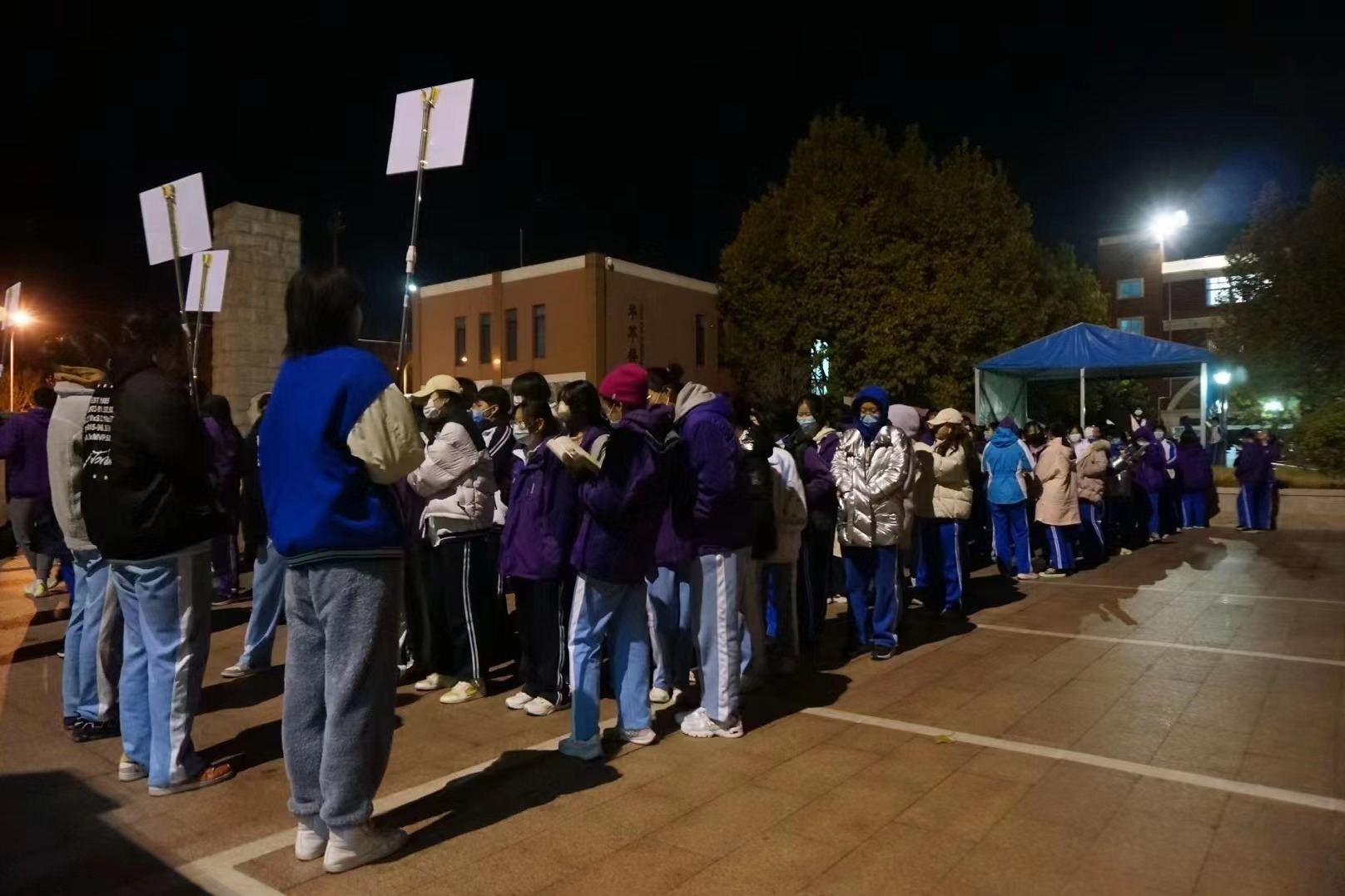 本次演习地点为华西楼,晚上22:00,在演习总指挥、住宿部唐秀梅老师下达演习开始指令后,同学们按照疏散路线,迅速到达学校西门广场集合。整场演习耗时4分32秒,疏散过程安全、快速、有序。