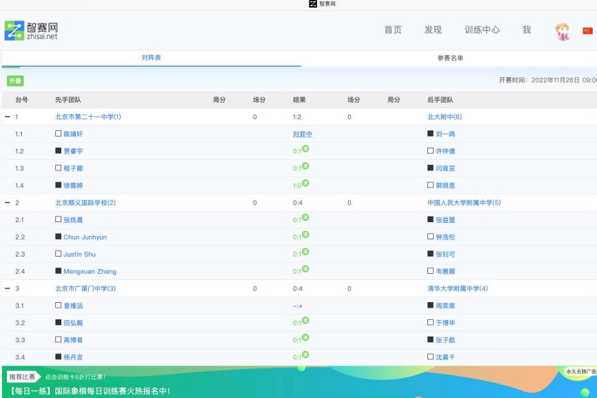 11月14日,北京市棋牌运动协会公布2022年全国国际象棋校园联赛北京赛区线上选拔赛规程。澳门博彩在线国际象棋领队赵晨光老师立刻做出回应,结合队员的时间、技术侧重点等情况,最终确定由初2209班周奕宸、初2115班于博华、高2107班张子航和初2203班沈莫千,代表澳门博彩在线参赛。在11月26日一上午五轮的激战过后,澳门博彩在线综合分数排名第二,挺进全国赛。
